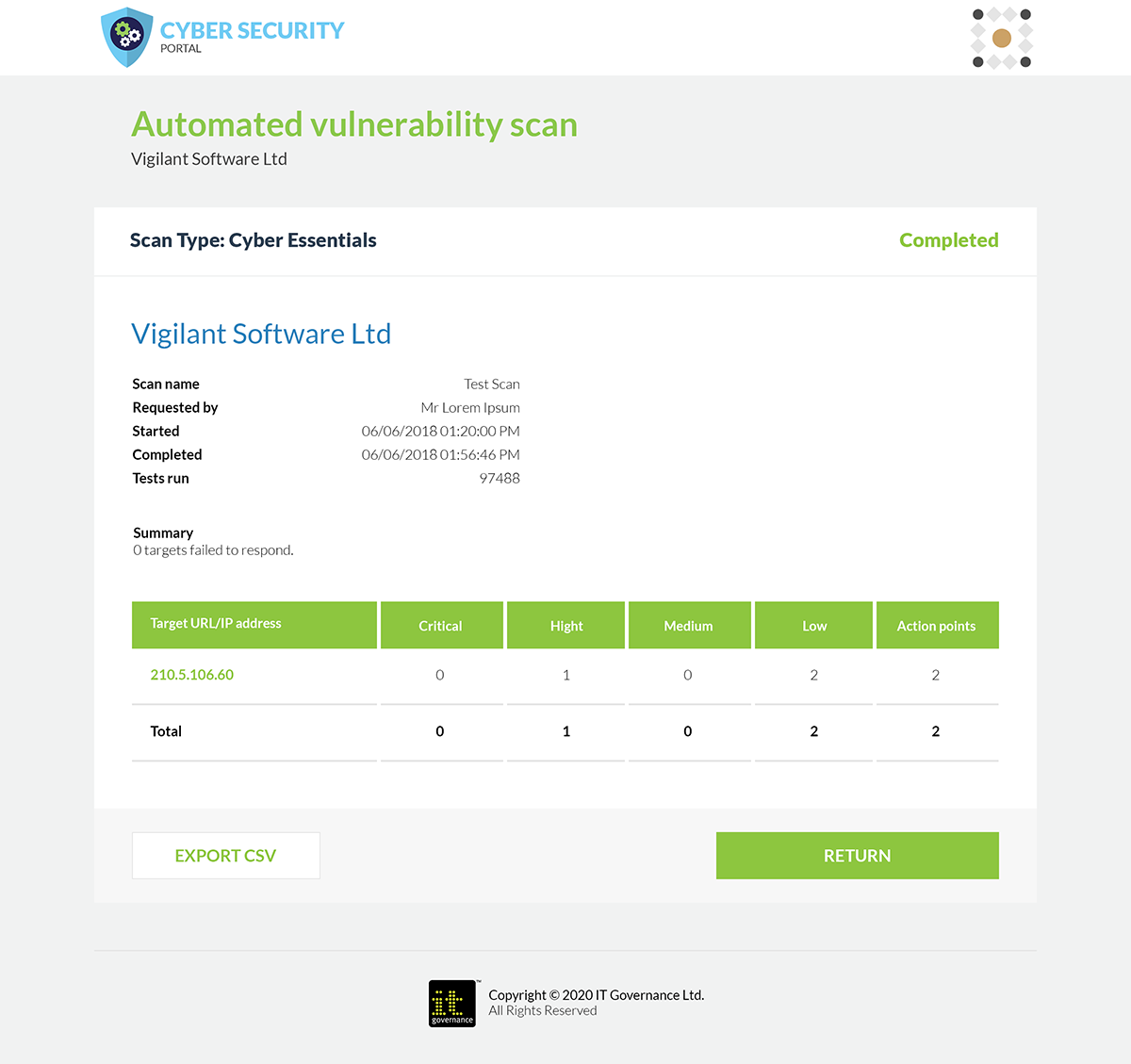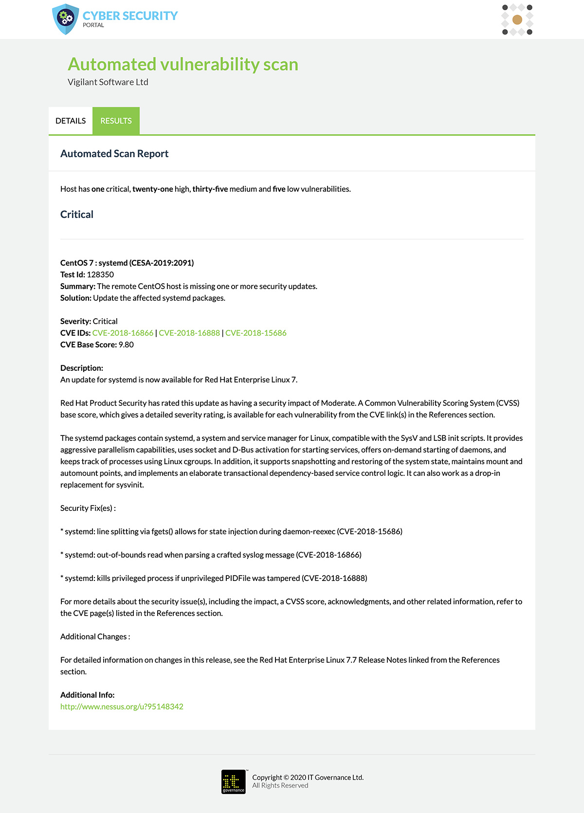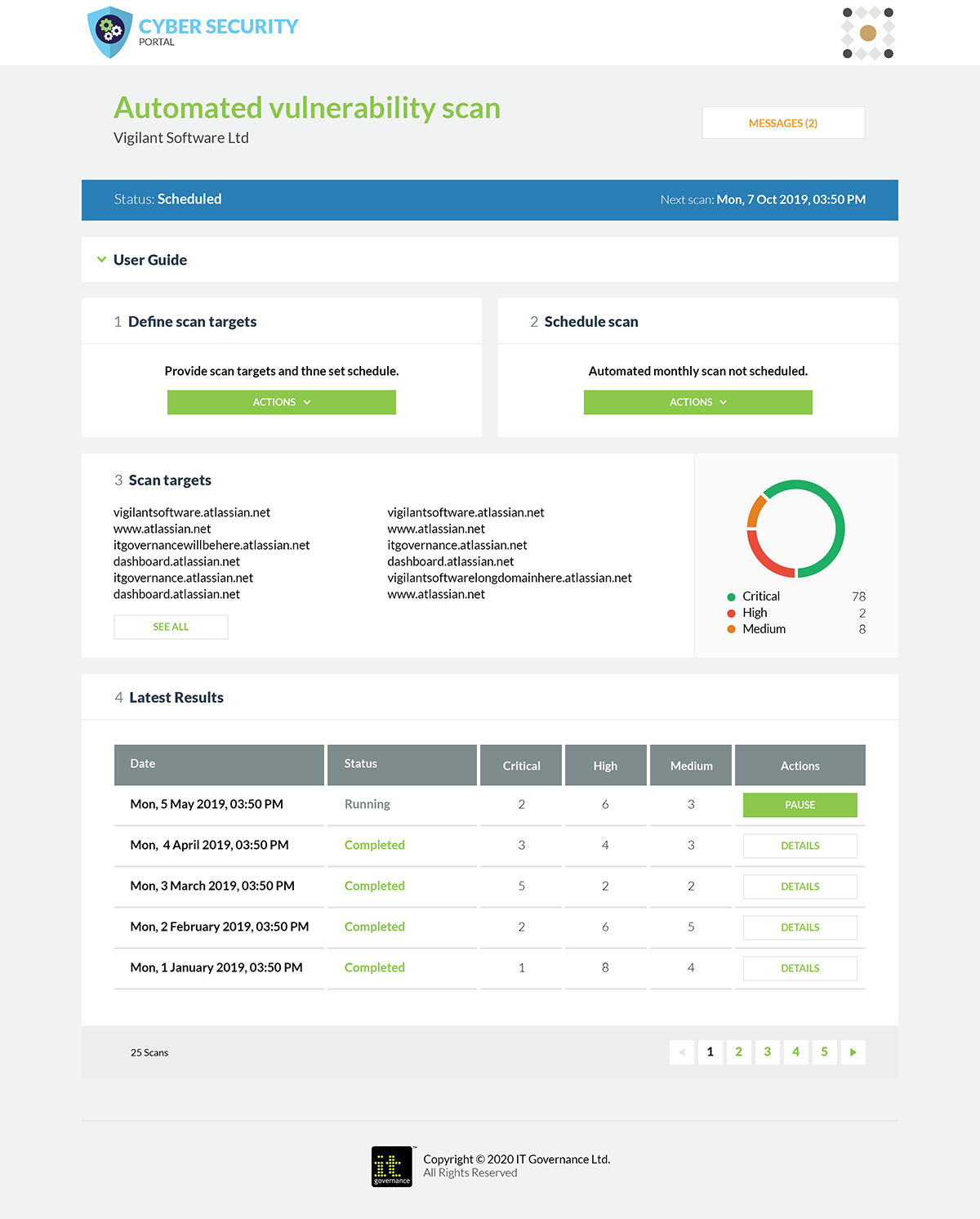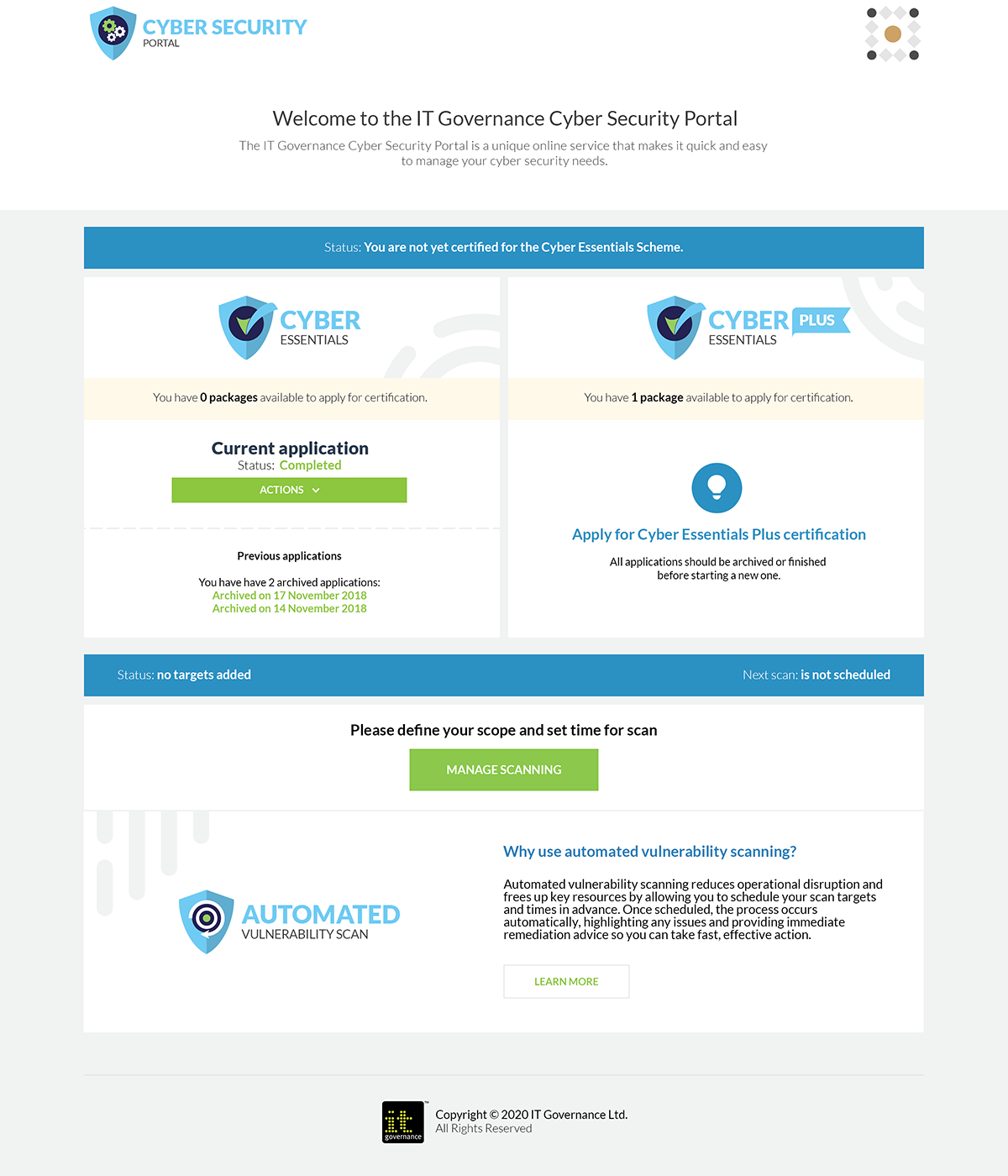 The ‘Scanned by IT Governance’ badge will only display if vulnerability scans are repeated monthly, and will not display if critical/high-risk vulnerabilities have not been addressed within two weeks.